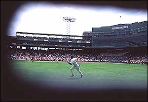 A view of the action from inside the wall. Fenway Park's Green Monster contains one of baseball's last hand-operated scoreboards. (Stan Grossfeld is a Globe associate editor)