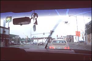 A view of downtown West Frankfort, Illinois through the windshield on Lori Kelso's minivan.