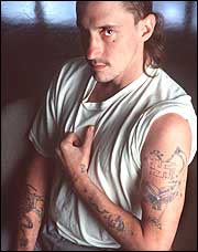 Gregory Bryant Mitchell, an inmate at the Fulton, Missouri, Penitentiary, shows his swastika tattoo flanked by the words "White Power." He says it was a youthful mistake.