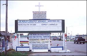 In Hayti, Missouri, monuments adorn many roadsides. This sign says God has revealed that an airport will be built on the site.