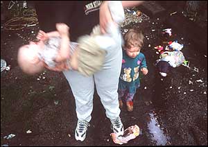 Susie Householder shifts the weight of her infant son Dylan while her daughter Kendra joins her in the front yard.
