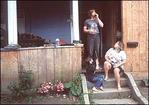 On the front porch of the home he bought at an auction for five dollars, David Tennant talks with his wife Deanna and his stepdaughter Sonya Prince, 9.