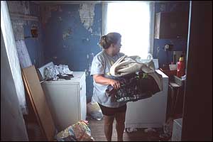 Deanna Tennant does laundry in the family home. They are trying to fix it up, with some help from a church group.