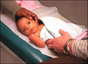 Nov. - March 1999 Soothed by her father's tough, a jaundiced Naia patiently allows her cardiologist, Dr. Harris Leopold, to examine her.