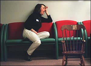 Tierney yawns in the surgical waiting room, near a rocking chair that bears a memorial plaque to a child who died.