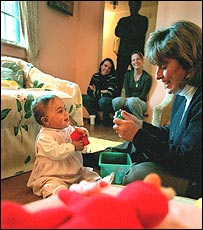 Naia, with her physical therapist Mary Halloran, as her mother, father and aunt look on.