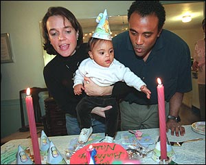 Blowing out the candles is a family effort at Naia's first birthday celebration.