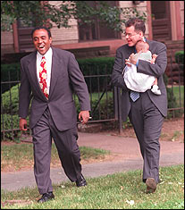 Greg walks with Naia's Godfather Kyle Rudy as he carries her to her Christening.