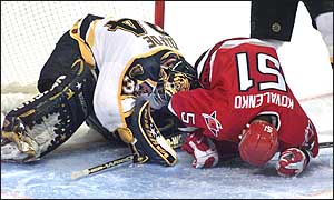 Fleet Center, Boston: 04/26/99 Carolina's Andrei Kovalenko and the Bruins' Byron Dafoe look like they are involved in a lacrosse face off, but what they are actually involved in is the game controversial game winning goal that was credited to Kovalenko in the third period.