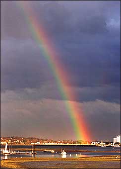 Dorchester Bay, Mass: 04/17/99 A rainbow touches down over Dorchester Bay and a boat docked at the Umass Campus Dock, and the sun peeked out during a downpour as dusk approached.