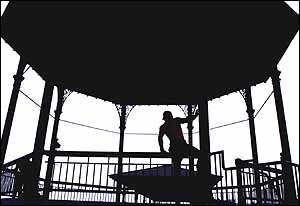Revere: 06/29/99 A man sits in the shade of the Revere Beach Bandstand on another sweltering day.