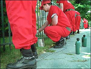 New Bedford, Mass: 06/16/99 Bristol Co. inmate Scott Rego paints a fence outside the Correctional Addiction Center in New Bedford as part of the first days work in as part of Massachusetts first chain gang.