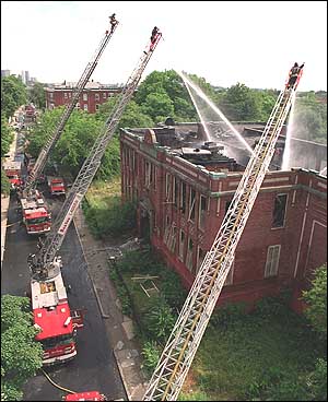 Dorchester, Mass.: 06/15/99 Boston firefighter work to extinguish a 6-alarm fire in a recently gutted abandoned school building on Magnolia Street.