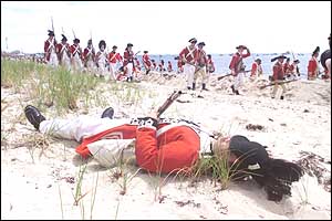 Falmouth, Mass.: 06/012/99 A dead British soldier lays in the sand after the British are defeated by the Falmouth militia during a reenactment of the Battle of Falmouth Harbor.