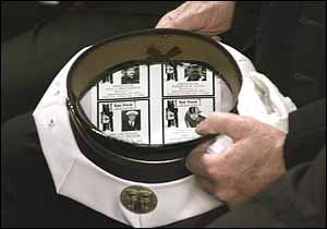A Worcester firefighter holds his cap on his lap during the memorial service with photos of his fallen commrades inside.