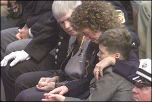 An emotional Linda McGuirk, center, wife of firefighter Joseph T. McGuirk, embraces her son Everett.