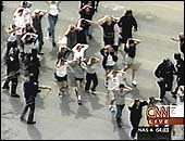 At one point, a bloodied young man dangled from a second-floor window, his right arm limp, and was helped down by two SWAT team members. His condition was not immediately known.