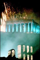 ATHENS, Greece -- Giant columns of light shot skyward from the Acropolis and bathed the 2,500-year-old Parthenon in a bluish glow as Greece welcomed the millennium Saturday with celebrations from the ancient citadel overlooking Athens.