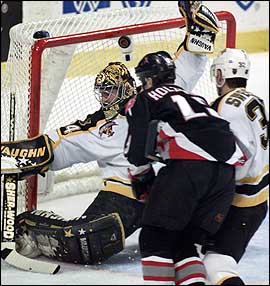 Byron Dafoe makes the excellent save, but the puck went straight up over his head, in first period action. (Globe Staff Photo / Jim Davis)