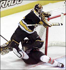Bruins goalie Byron Dafoe goes up and over a downed Buffalo Sabre as he tries to get back into the crease. (Globe Staff Photo / Barry Chin)