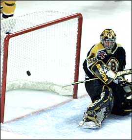The Sabres third period barrage - an 18-7 shot edge - got to Byron Dafoe in the seventh minute, tying the game on a Rhett Warrener goal. (Globe Staff Photo / Barry Chin)