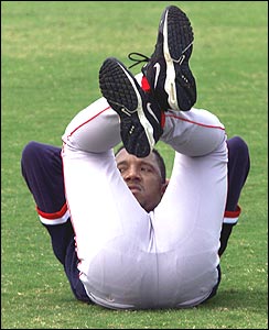 Red Sox pitcher Pedro Martinez stretches at the end of his workout. (Globe Photo / Frank O'Brien)