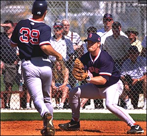 Catcher Scott Hatteberg waits to tag runner Bryce Florie during drills today.