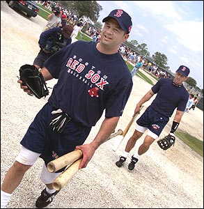 John Valentin is followed to the batting cage by Nomar Garciaparra at practice today.