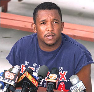 Sox pitcher Pedro Martinez, showed up for camp a day late and addressed the press after his workout.