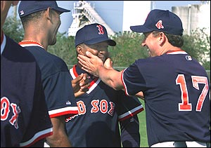 Sox pitcher Bret Saberhagen welcomes Perdro Martinez to camp as Ramon Martinez (L) looks on.
