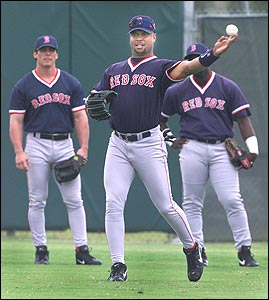 Sox outfielder Troy O'Leary tosses a ball. Marty Cordova and Carl Everett are seen behind him.