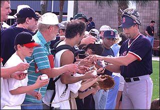 The largest spring training crowds in many years have come out to watch Bret Saberhagen and the Sox practice. (Globe Photo / Frank O'Brien)