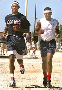 Sox pitchers Ramon and Pedro Martinez participate in the pitchers run. Both seemed content to run together about mid-pack. (Globe Photo / Frank O'Brien)