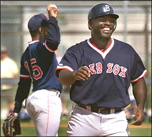 Carl Everett laughs after being tagged out by Donnie Sadler. (Globe Photo / Barry Chin)