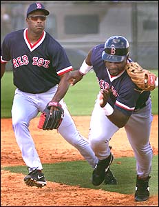 Carl Everett is caught in a run down and tagged out as second baseman Jose Offerman closes in.