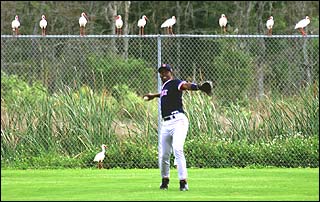 Red Sox staff member, no. 78 Gary Jones has an audience of birds during practice today.