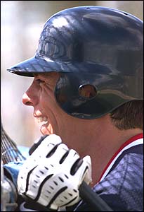 Marty Cordova waits for his turn at batting practice today. (Globe Photo / Barry Chin)