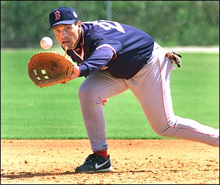 1st baseman Brian Daubach fields grounders at practice today. (Globe Photo / Barry Chin)