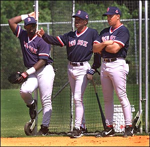 Red Sox 1st Base Coach Tommy Harper, center, talks with outfielders Carl Everett, left, and Darren Lewis at right. (Globe Photo / Barry Chin)