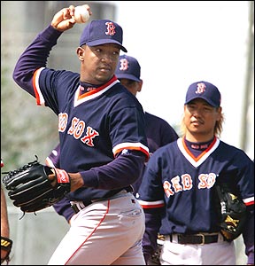 Red Sox pitcher Pedro Martinez works on his pickoff move. Korean pitcher Sang Lee can be seen watching behind him. (Globe Photo / Frank O'Brien)