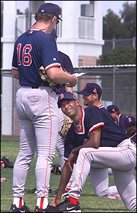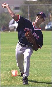 Left: Sox pitching coach Joe Kerrigan talks with Ramon Martinez. Right: Ramon hurls one during practice.