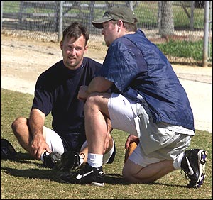 Red Sox pitcher Tim Wakefield and catcher Scott Hatteberg, both looking to get back on solid ground with the Red Sox during spring training.