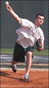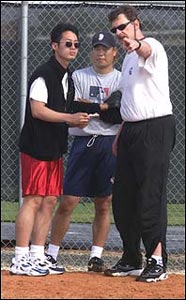 Left: Red Sox pitcher Brian Rose gets in some throwing on his first day in camp. Right: Sox pitching coach Joe Kerrigan, talks to pitcher Sang Lee through his translator Park Seung-Hyun.