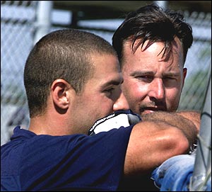 From left: Catcher Steve Lomasney and pitcher Tim Wakefield take a break in Fort Myers.