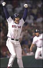Everyone was surprised by Brian Daubach, who thinks he has a game-winning grand slam, only to see it go foul. No matter, he would send the next pitch off the wall. (Globe Photo Jim Davis)