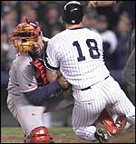 A magical season came to a crashing halt in the ALCS, as Scott Brosius and the Yankees barreled over Jason Varitek and Co. in five games. (Globe Photo / Barry Chin)